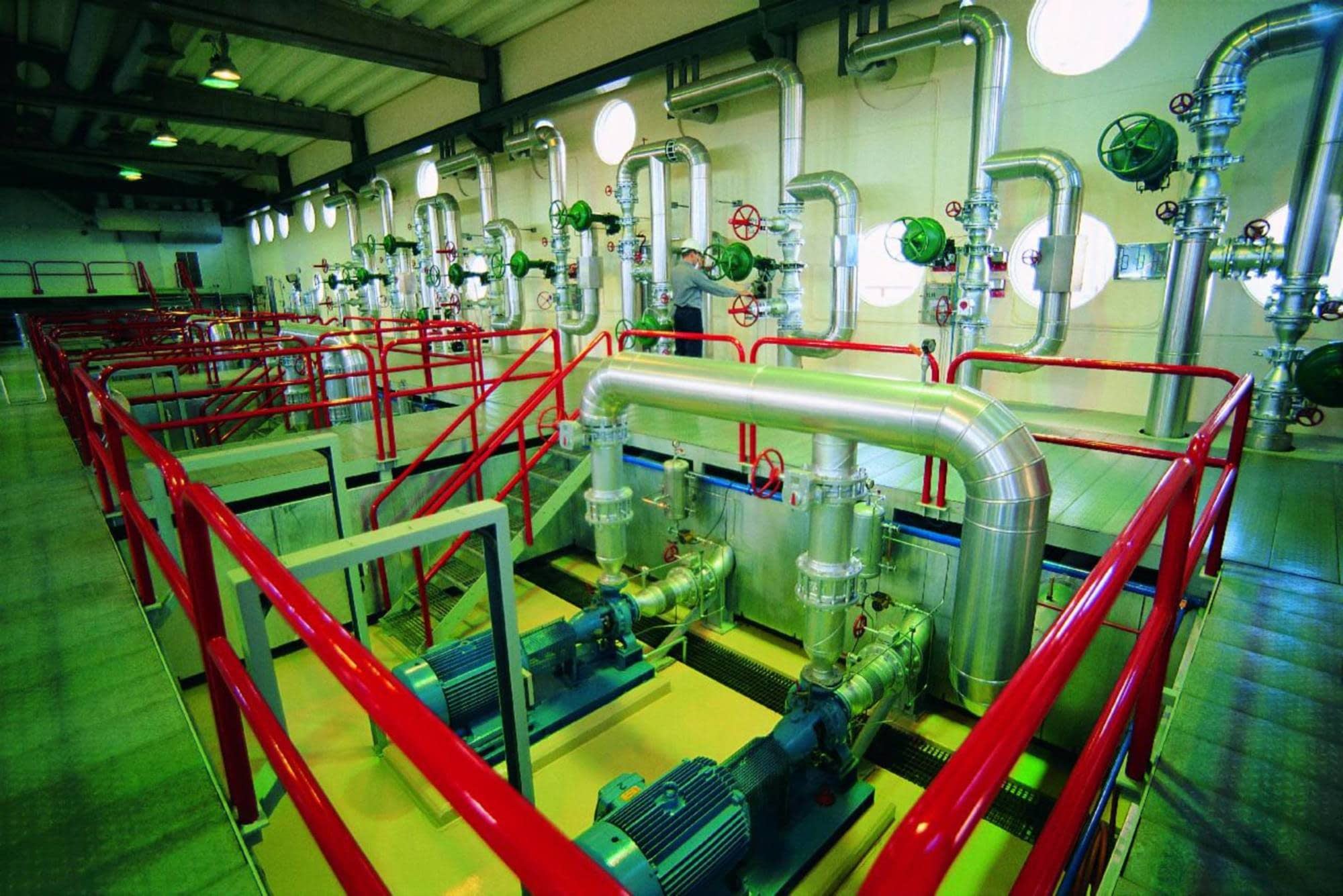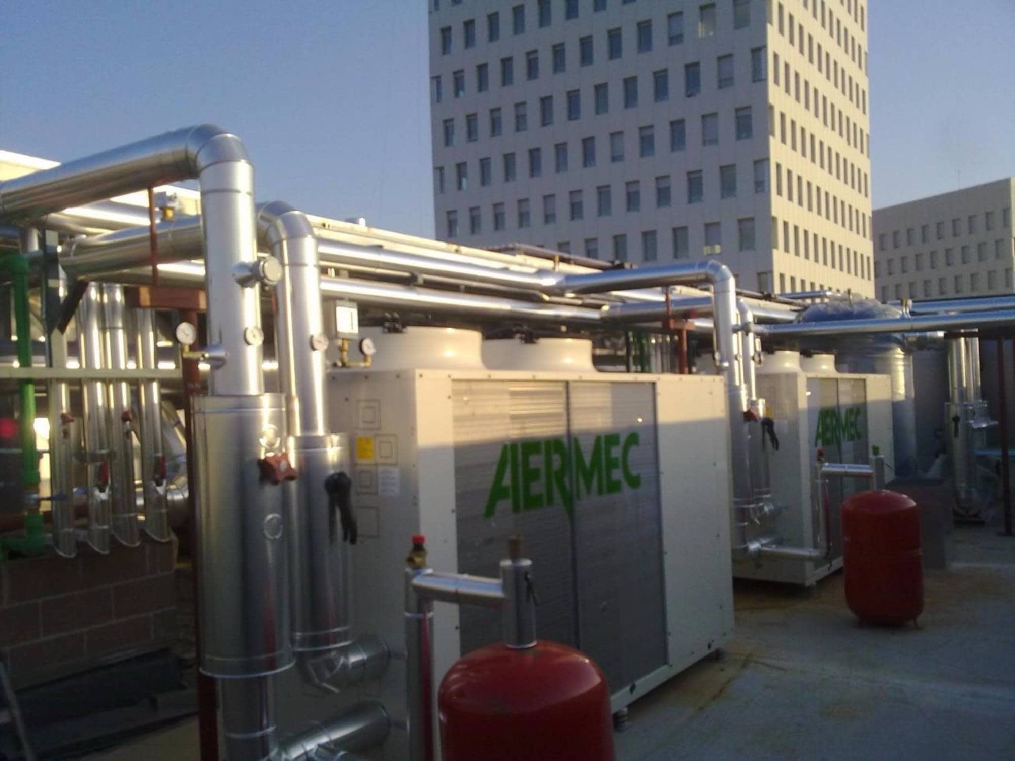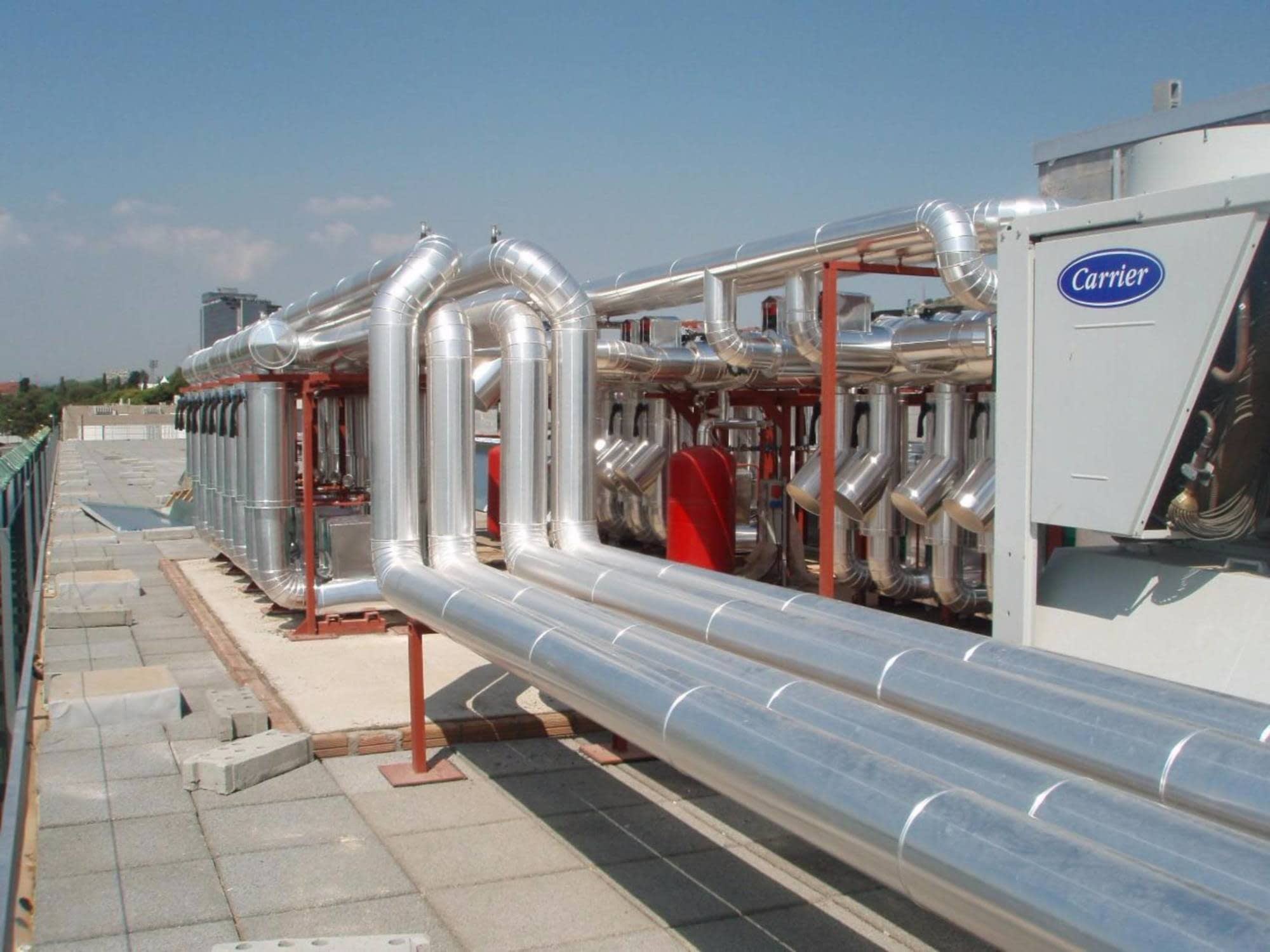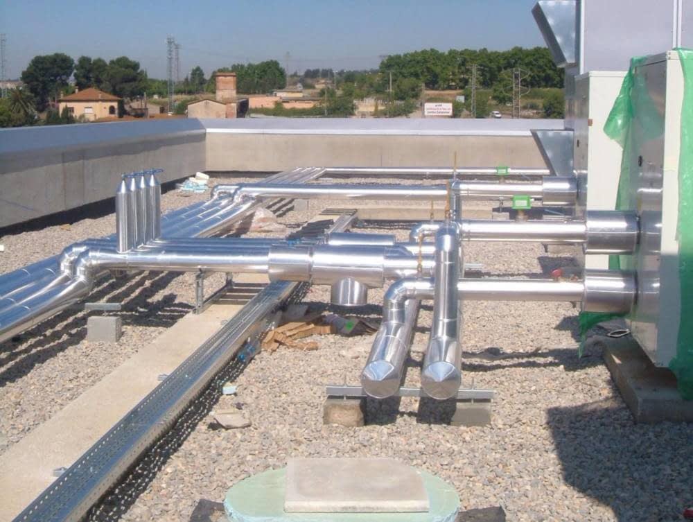 Montaje de los equipos de bombeo, la instalación de tuberías de impulsión y retorno, así como la integración de válvulas, elementos de regulación y sistemas de seguridad, completamente aislados y acabados con aluminio inoxidable.